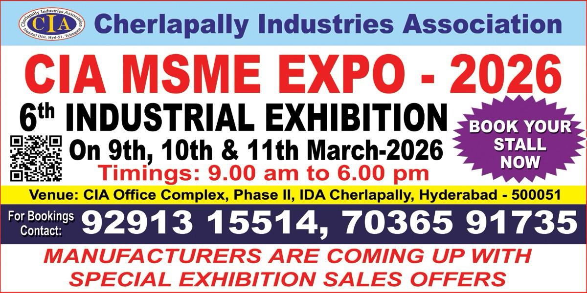 Cherlapally Industries Association (CIA) is pleased to inform you that we are organizing MSME EXPO – 2026, an Industrial Exhibition at the CIA Complex, Cherlapally, from 09th to 11th March 2026.